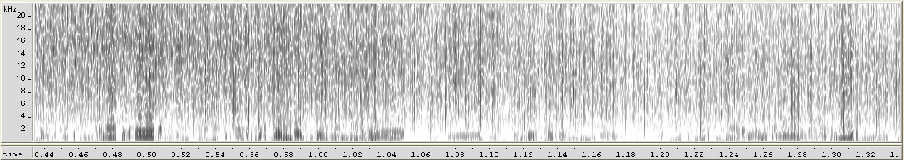 I slutet av 1990-talet, då Fugas utgåva Ida Ekman: Recordings 1904–1908 gjordes, kunde knastret redan avlägsnas enkelt (bild 6). Här märker man också en tydlig förändring i förhållandet till bruset. Det framkommer inte i skivkonvolutet hur ljudet bearbetats, men bruset har accepterats som en jämntjock del av ljudbilden ända upp till 6 kHz. En påtaglig skillnad till de övriga skivorna är att överföringen förmodligen har gjorts med fel hastighet, vilket sänkt tonhöjden och gjort helhetsklangen grumlig.